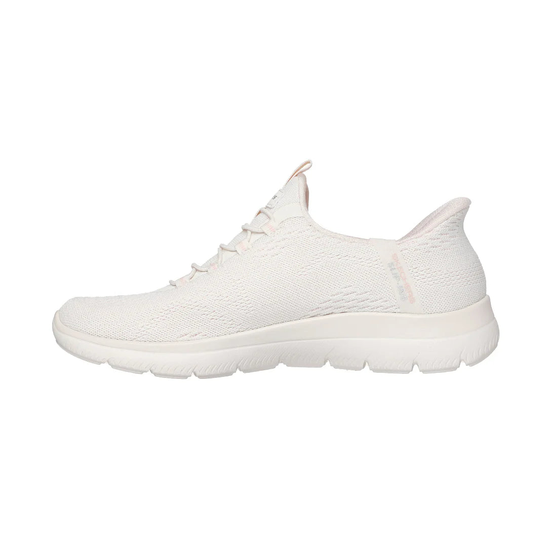 Take your daily routine to the next level with maximum comfort thanks to the Skechers Slip-ins: Summits - Dream Chaser. This style combines a modern, functional design with Hands-Free Slip-ins technology, allowing you to slip them on easily without using your hands. The Heel Pillow system keeps your foot firm and stable, while the Skechers Air-Cooled Memory Foam insole provides breathable cushioning and softness with every step. The engineered mesh upper with fixed elastic laces offers a secure and flexible fit, and the lightweight midsole absorbs impact for a more natural stride. They are also machine washable, 100% vegan, and feature a flexible outsole with traction for optimal grip.
